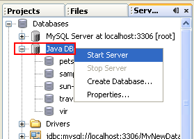 The database server used is Java DB (derby) and the database name is sample. We can view the sample database details from the Services page.