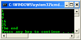 for (int n = 0; n < 1000; n++) { int square = n * n; if (square > 3500) { break; } Console::WriteLine(square); }